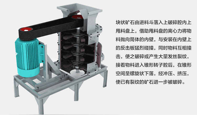 物料由機(jī)器上部垂直落入高速旋轉(zhuǎn)的葉輪內(nèi),在高速離心力的作用下,與另一部分以傘狀形式分流在葉輪四周的物料產(chǎn)生高速撞擊與粉碎,物料在互相撞擊后,又會(huì)在葉輪和機(jī)殼之間以物料形成渦流多次的互相撞擊、摩擦而粉碎,從下部直通排出,形成閉路多次循環(huán),由篩分設(shè)備控制達(dá)到所要求的成品粒度。