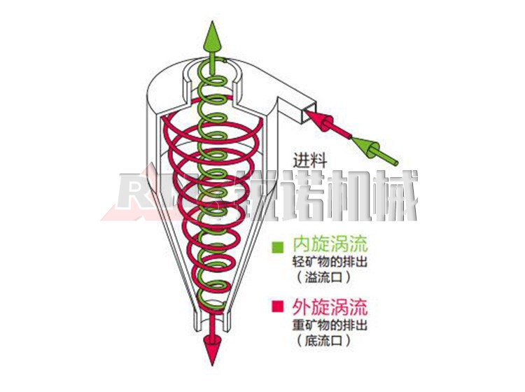 水力旋流器用砂泵(或高差)以一定壓力(一般是0.5~2.5公斤/厘米)和流速(約5~12米/秒)將礦漿沿切線方向旋入圓筒,然后礦漿便以很快的速度沿筒壁旋轉(zhuǎn)而產(chǎn)生離心力。通過離心力和重力的作用下,將較粗、較重的礦粒拋出。